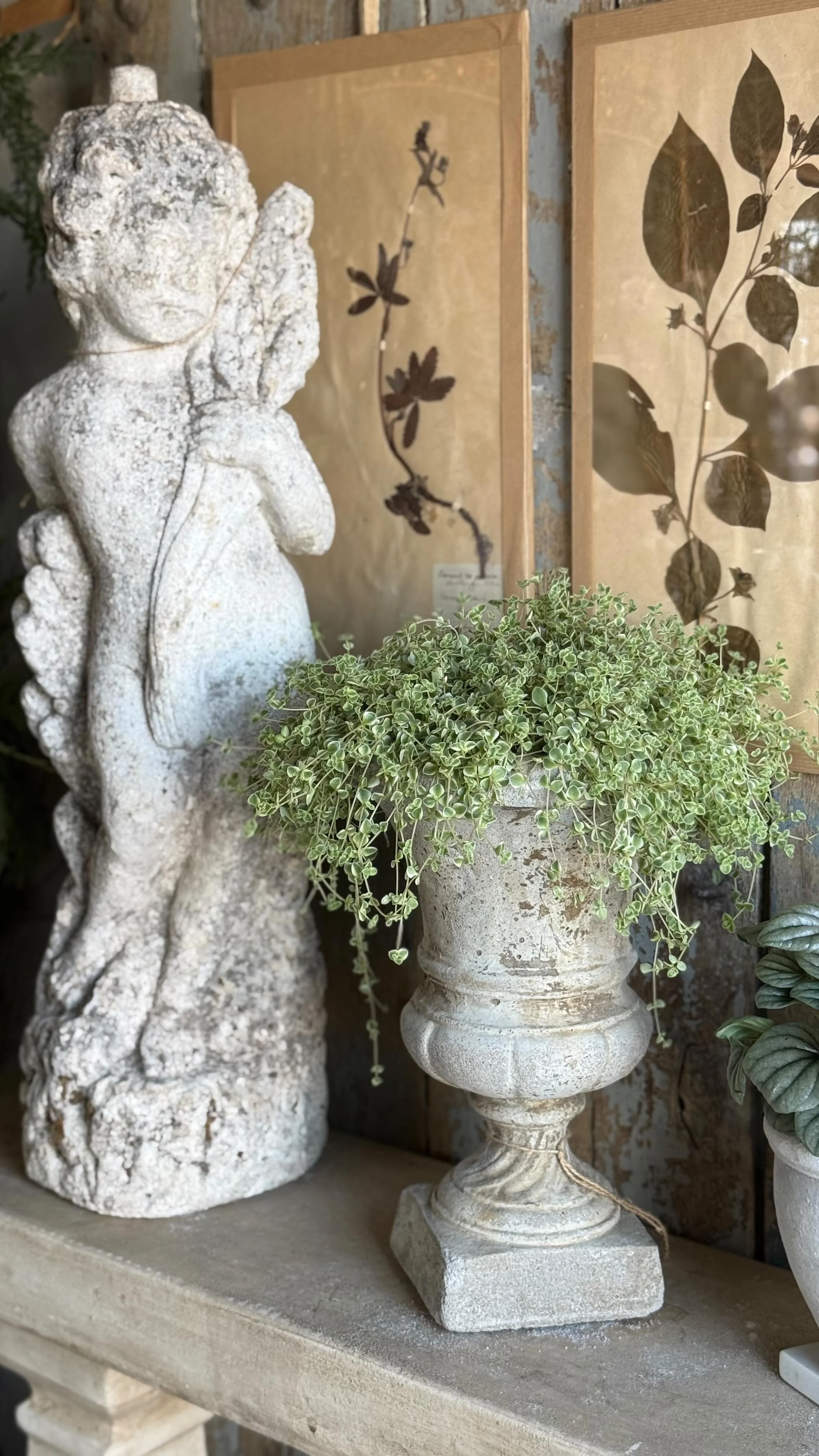 Unique varieties of plants and dish gardens in handmade pots and vintage urns are sprinkled around the shop to complement the space. Blooming orchids and topiaries stand tall on a farmhouse table, while trailing ivy and succulents accompany vintage watering cans and botanical books.