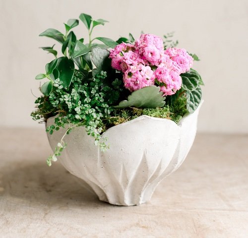 Planted in our popular lotus-shaped cement flower pot: 7” D x 4.5” H