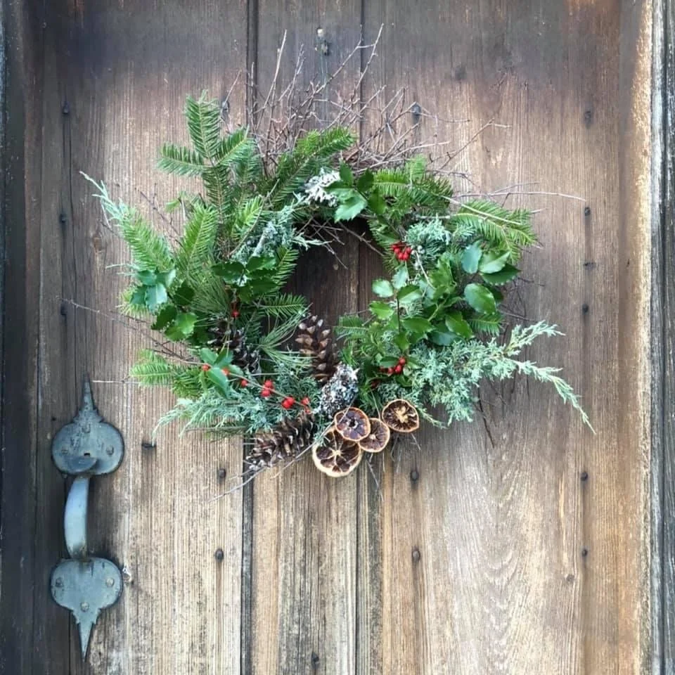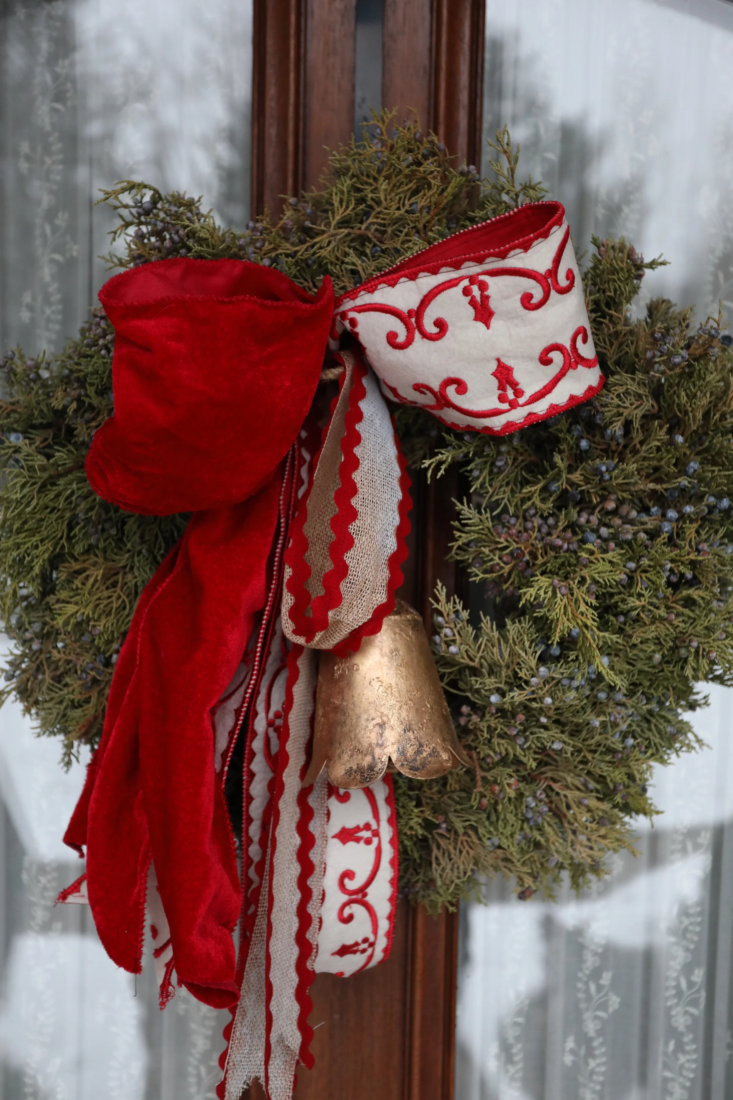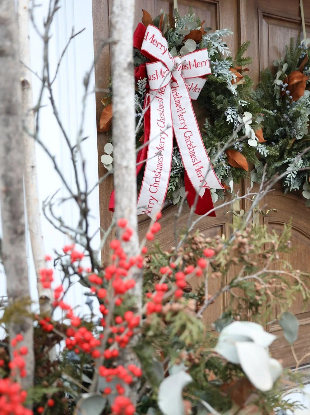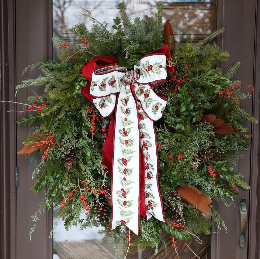 Evergreen and grapevine wreaths adorned with fresh greenery, berries, pinecones, winter accents and stunning bows made with our signature French ribbon