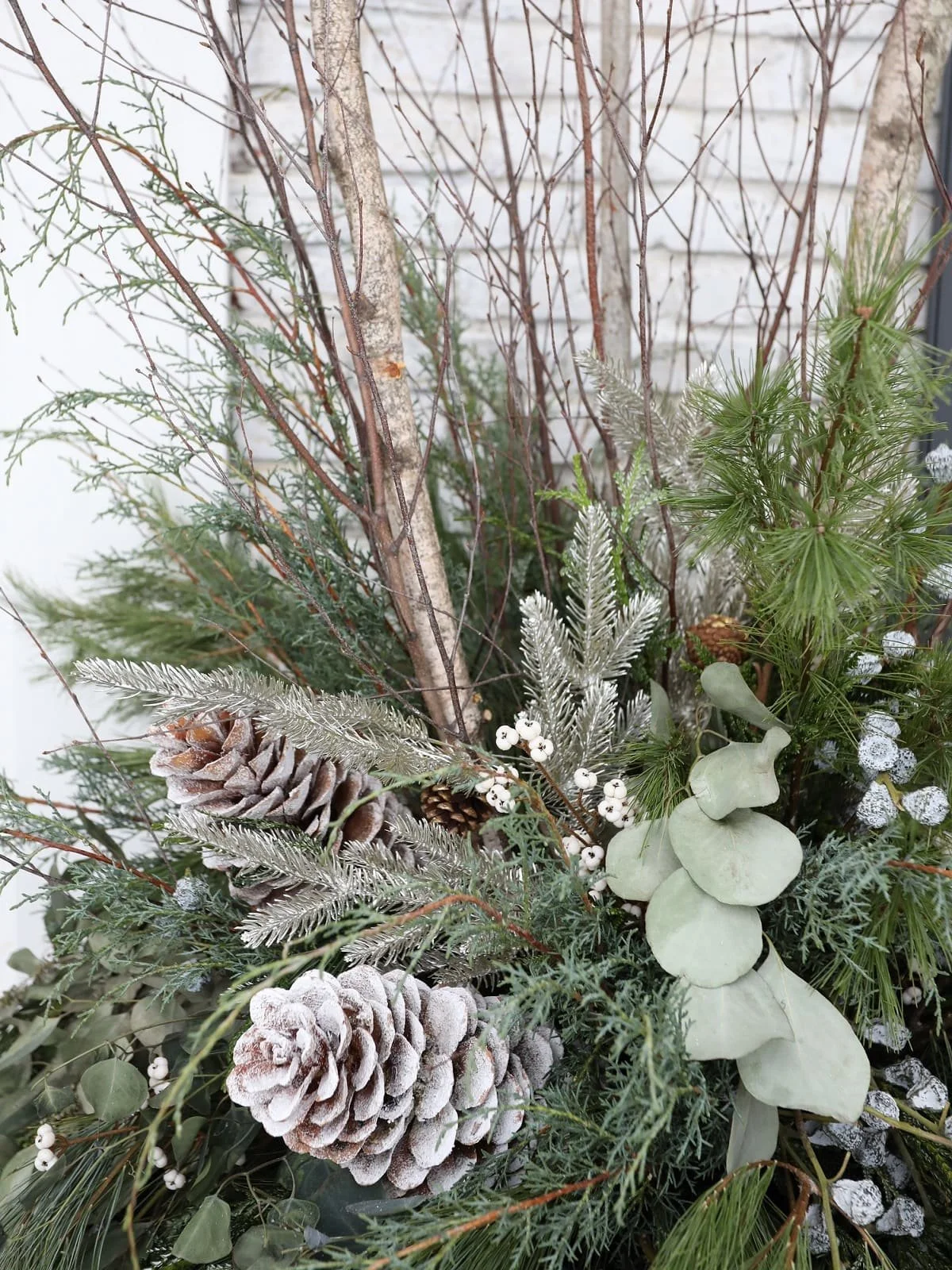 Planters with hardy evergreens, berries, pods, birch logs, pine cones and winter accents